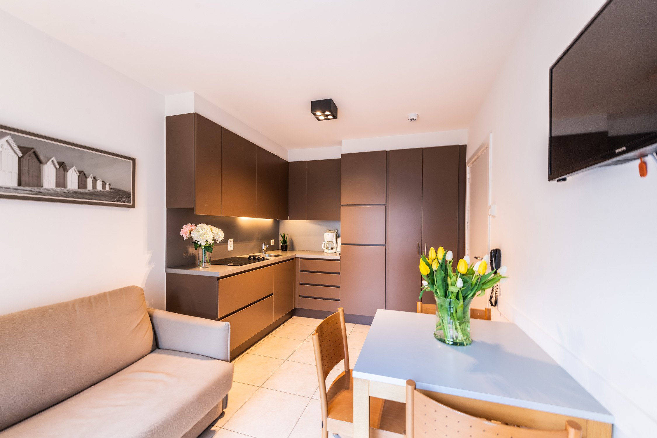 Cette suite élégante est un appartement avec service hôtelier, comprenant une chambre séparée et un canapé-lit pour une personne dans le salon. Elle offre un cadre de séjour agréable pour des vacances à la mer pour 2 à 3 personnes.
